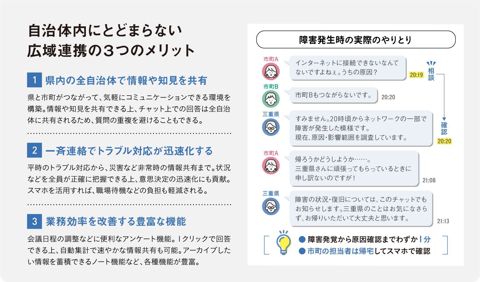 特に通信障害の発生時が印象的だったという。「原因はネットワークの一部の問題でしたが、トラブルが発覚した後、約1分で県から全市町に向けて情報を発信し、混乱を最小限に抑えることができました。電話やメールでこのスピードは難しいでしょう」。