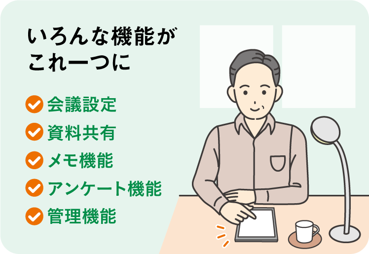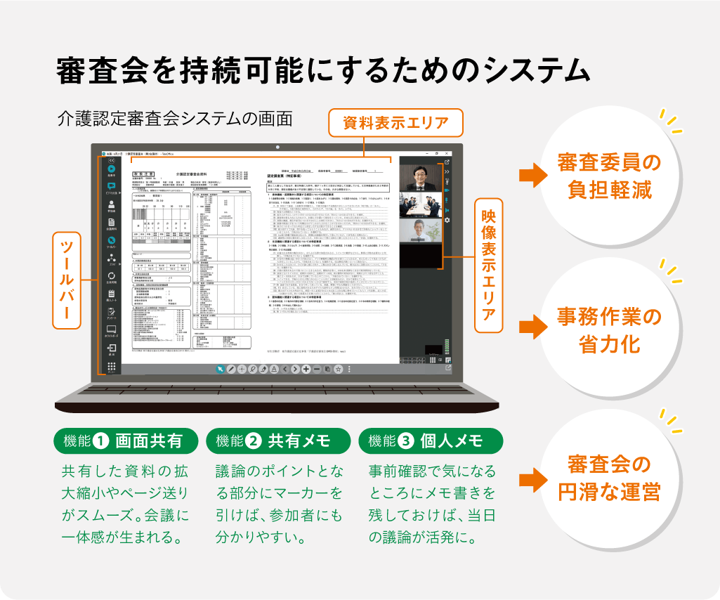 一般的なWEB会議システムとの違いは、ペーパーレス化の仕組みが備わっていること。オンライン化とペーパーレス化を両立できることが導入の決め手だったそうだ。会議資料を事前に共有・閲覧できるほか、各種メモ機能が豊富に揃う。会議前に自分用としてメモ書きを残したり、会議中にメモを共有したり、紙の資料と同じように作業することができるという。このほか、審査委員を審査会ごとにグループ登録できるため、会議の設定が簡単に。会議の案内なども送付できるため、職員の業務負担も軽減される。