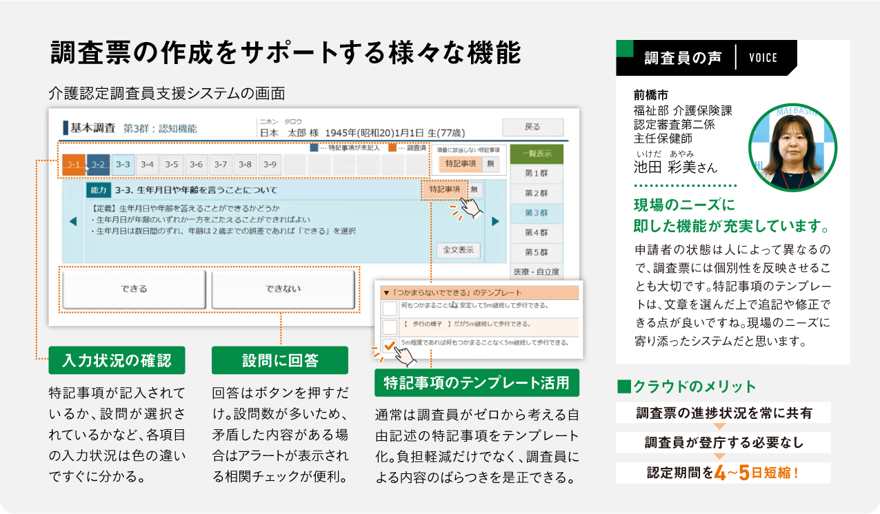 同社は長年、自治体から要介護認定の調査業務を受託してきた。開発した本システムも、すでに年間18万5,000件の調査実績があり、現場の評判も上々という。
