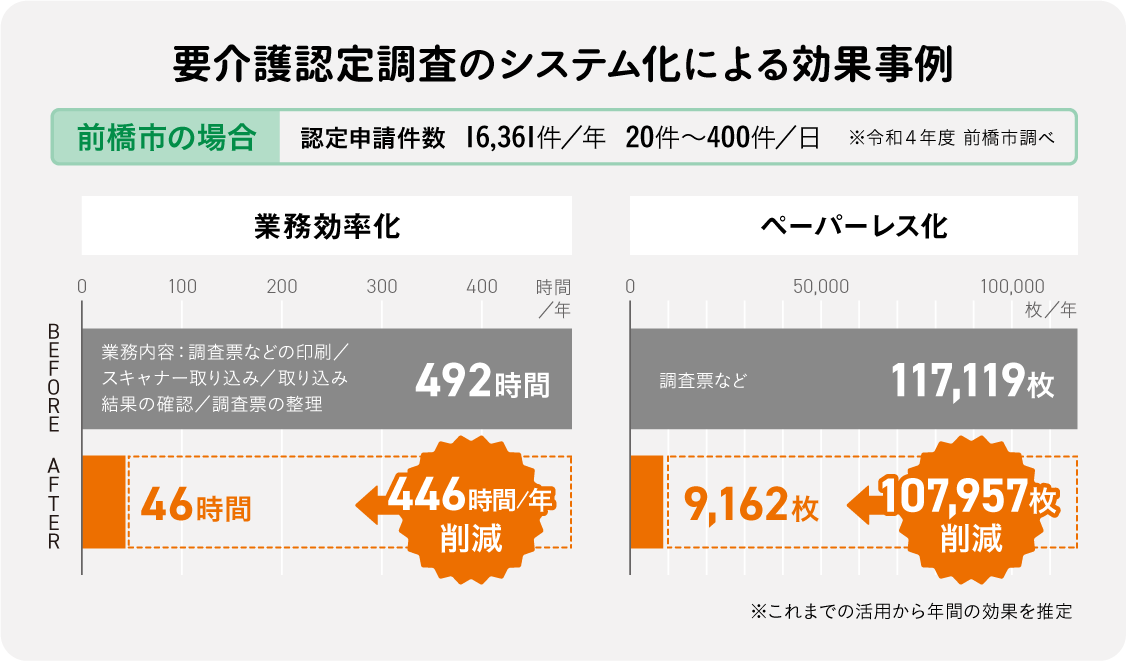 要介護認定業務では、申請から30日以内に結果を申請者に通知する必要がある。高齢化で申請件数が増える中、それを守りつづけるのは難しい。そこで前橋市では、煩雑な調査票の作成にシステムを導入。調査期間の短縮に成功したという。
