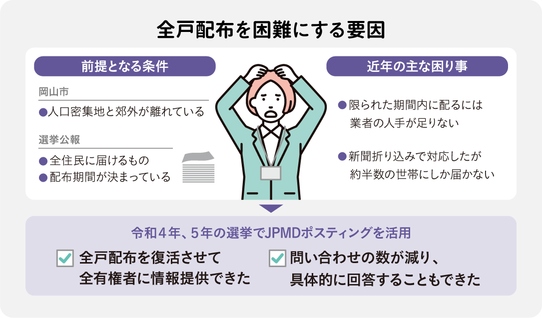 令和4年の参議院議員選挙で委託したところ、スムーズに配布でき、問い合わせ数も減少。令和5年の県議会議員・市議会議員選挙でも同社が2区で実施することになった。
