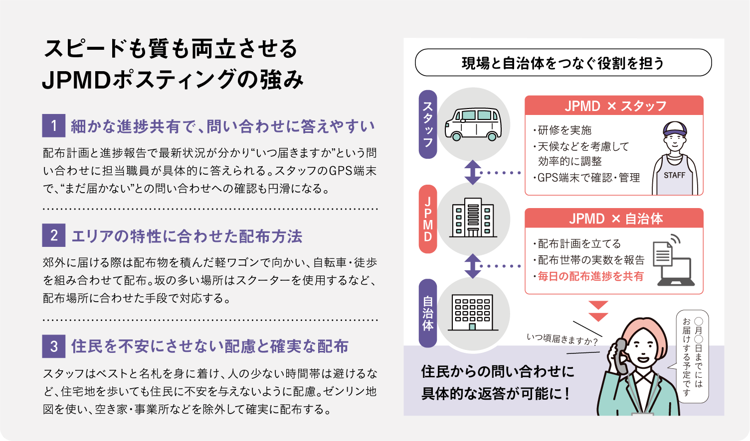 住民の安全に関わるハザードマップなど、郊外まで漏れなく届けたい配布物に適したサービス。ほかにも家庭ごみ収集の案内、広報紙などの定期的な発行物にも対応できる。