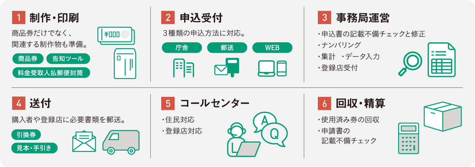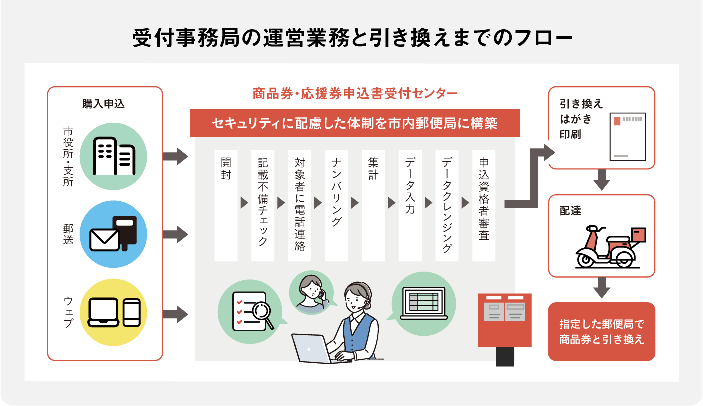 商品券事業は、非常に多くの工程を並行して進める必要がある。住民への事業周知、商品券・各種ツール類の制作、使用できる登録店の募集、引き換えはがきの発送など、関連領域が広いためだ。受託後の限られた時間でそれらの準備を可能にしたのが「JPコミュニケーションズ(以下、JPCOM)」の存在だ。