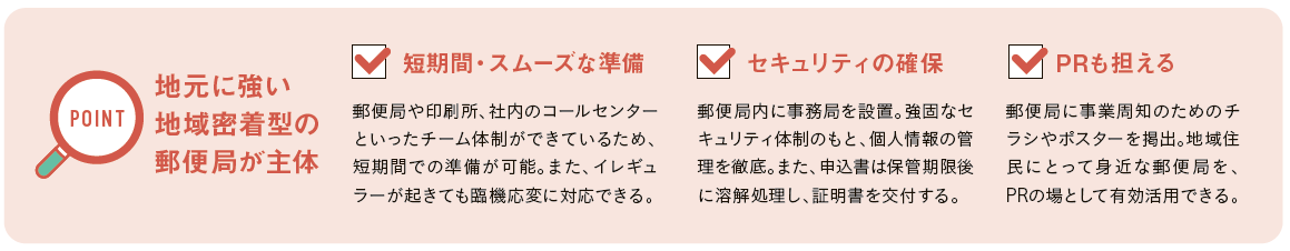 郵便局は地域に根差した身近な存在として知られている。商品券事業のほかにも様々な領域で、地域施策における支援の拠点として、複数の自治体が郵便局を活用している。