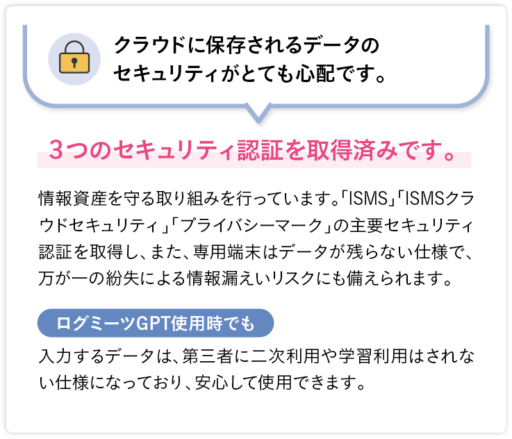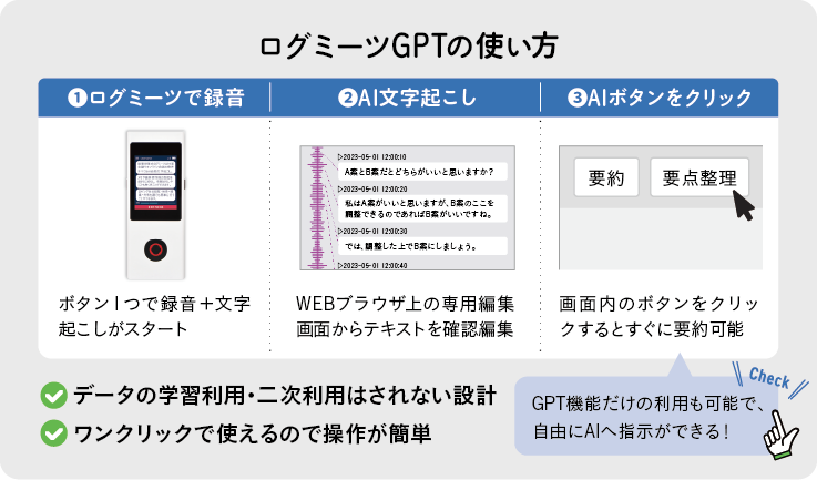 令和5年5月、ログミーツの新機能として、高度な生成AIとして注目を集めている「ChatGPT※1」の技術を搭載した「ログミーツGPT」が正式にリリースされた。従来のテキスト編集画面に追加されたボタンをクリックするだけで、文字起こしテキストがAIによって要約されたり、要点が箇条書きで整理されたり、様々な文章加工が可能になる機能だ。文章加工以外にも、チャットボットのような形で、AIに対して質問や要望を指示するといった使い方もできる。業務に活用すれば大幅な効率化につながる可能性を秘めているという。
