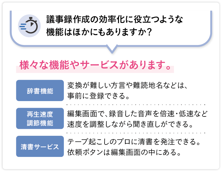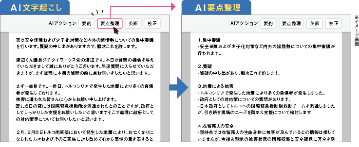 同機能を活用する大きなメリットとして、生成AIの知識がない職員でも、すぐに使いはじめられる点が挙げられる。通常、生成AIに何らかの処理を行わせるには、一定レベルのプロンプト※2作成スキルが必要とされる。そのスキルによって、AIの回答精度が左右されるため、AI活用において最初のハードルになりやすいという。しかし同機能には、あらかじめAIへのプロンプトがテンプレート化されたボタンが表示されている。そのため、ボタンをクリックするだけで文字起こししたテキストの要約や校正、ワード抽出などの様々な処理が実行される仕組みだ。さらに、ボタンの種類もニーズに合わせて随時アップデートされ、より簡単に生成AIが活用できるようになるという。
