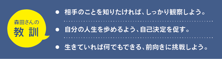 現場の職員たちと話し合いを重ね、子どもたちが自らの意志で決定できる環境づくりが大切だと気づきました。そのために、子どもたちのニーズを適切に把握するという基本に立ち返りました。一人ひとりを観察すると、それぞれの考えや悩み、課題が見えてきます。それをもとに子どもに対し、メリットやデメリットを伝え、選択肢を提示すること。どんな選択をしても100%正解はなく、もし失敗しても支えると伝えること。今、決めたことが正解でないこともあり、その時々で立ち止まり考えればいいと話すこと。そうやって、自分自身で決めることの大切さや重要性を伝え、行動化に努めました。