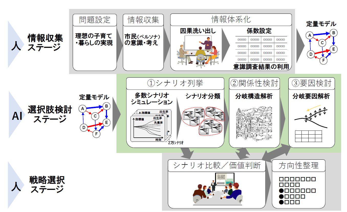 そこで、京都大学と株式会社日立製作所(日立京大ラボ)が開発を進めていた、AIを活用した未来シミュレーション手法を活用し、広島県福山市のペルソナと組み合わせることで、個人の価値観や行動レベルに注目しつつ客観的な未来予測を行うことができるのではないかと考えた。