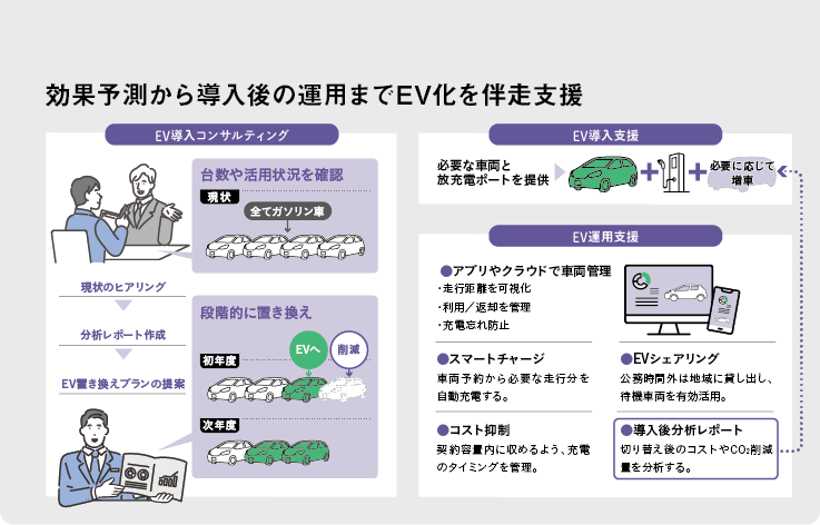 自治体とのプロジェクトを契機に、公用車向けのEV導入支援を始めた。