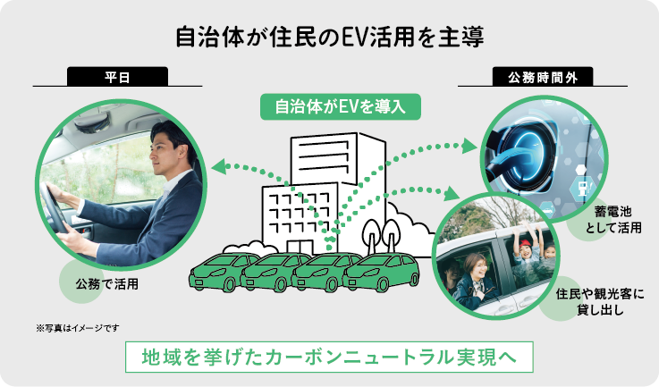 非常用電源やカーシェアに活用し、地域を挙げたEV化につなげる。