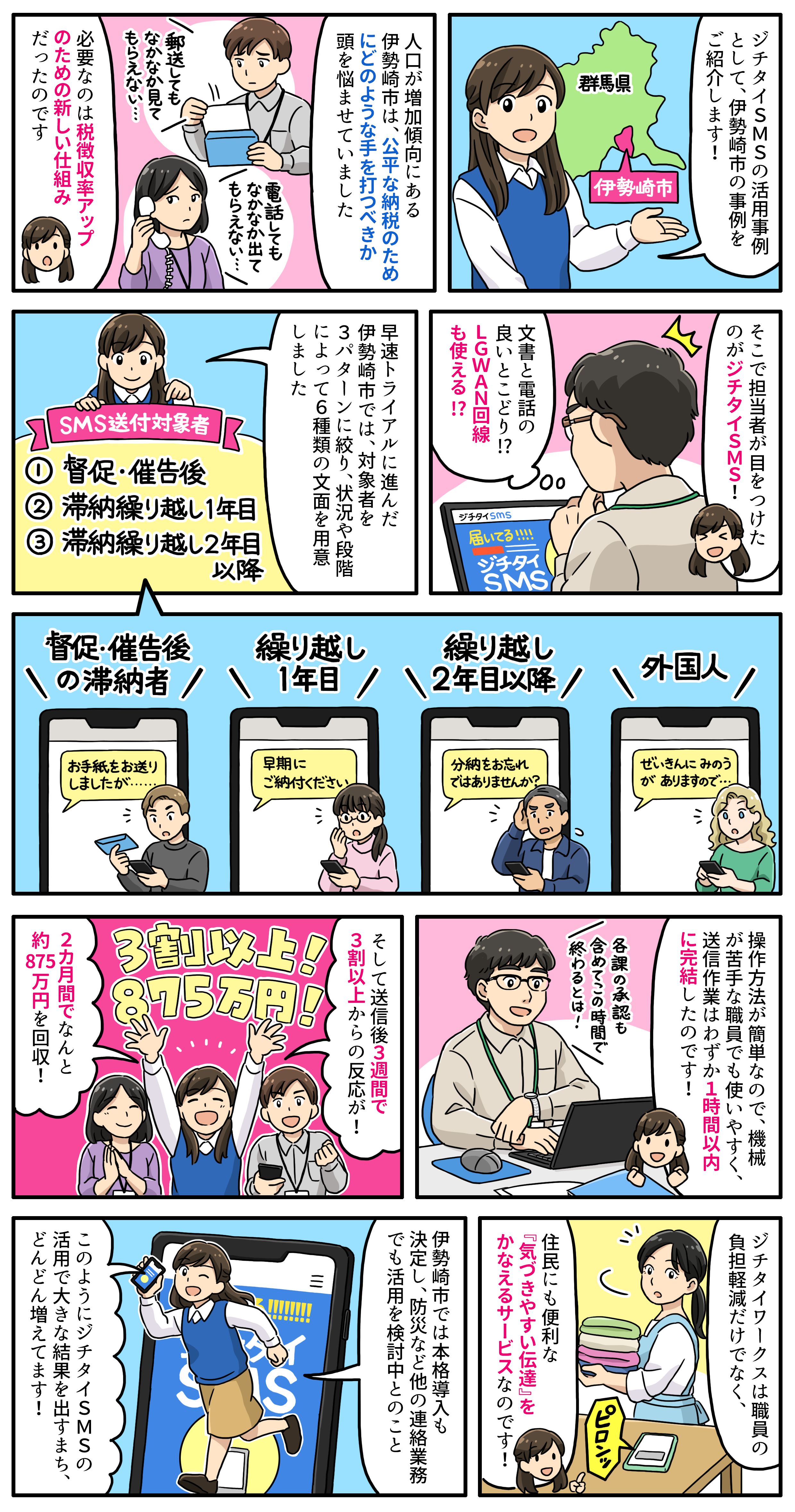 そうした中、伊勢崎市では徴収率向上のため、令和4年度から催告にSMSの活用を始めたといいます。その活用内容や効果についてマンガでご紹介します。