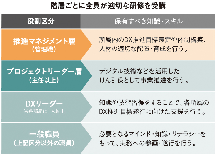 「階層ごとに求められるスキルや知識は変わってくるため、専門家(DX推進アドバイザー)の助言をもとに、必要なスキルと研修内容を整理していきました」。