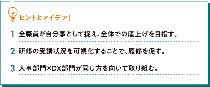 研修内製と受講状況の可視化で職員の意識変革を図る。