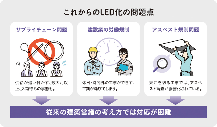 やり方が分からずまだ着手できていないという声をよく聞きます。しかし、従来の蛍光灯などに付いている安定器の生産は令和元年度に終了しています。安定器の耐久年数は10年ほどなので、既存の照明は数年以内に次々と寿命が来る状況です。これからLEDの需要が増えるとメーカーの供給が追い付かなくなり、不点灯のままLED化できない“サプライチェーン問題”が懸念されています。