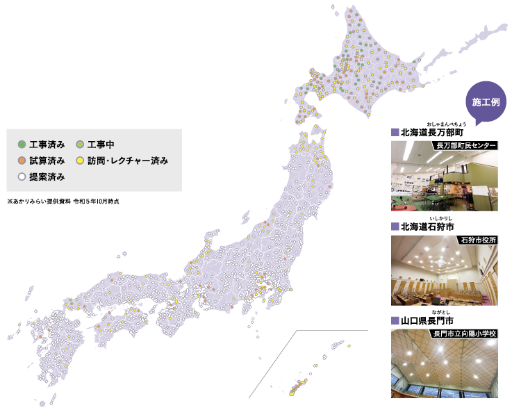 北海道から沖縄県まで、全国の自治体から試算や見積もりの依頼を受けている状況です。令和5年10月時点で、全国約40の自治体で工事完了・または工事中です。対象は役所、学校、病院、文化会館、スキー場、プール、グラウンドなど約1,000施設。