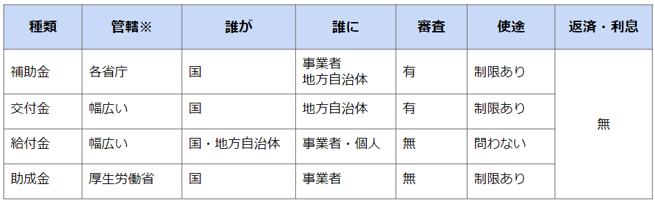 オム:文章だと全体像がつかみづらいので、それぞれの違いをまとめてみたよ。全てにおける共通点は、返済や利息が不要であること。それ以外の要素は似ているようで少し違うんだね。