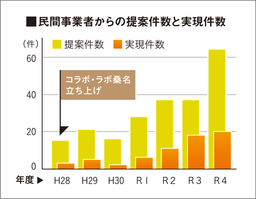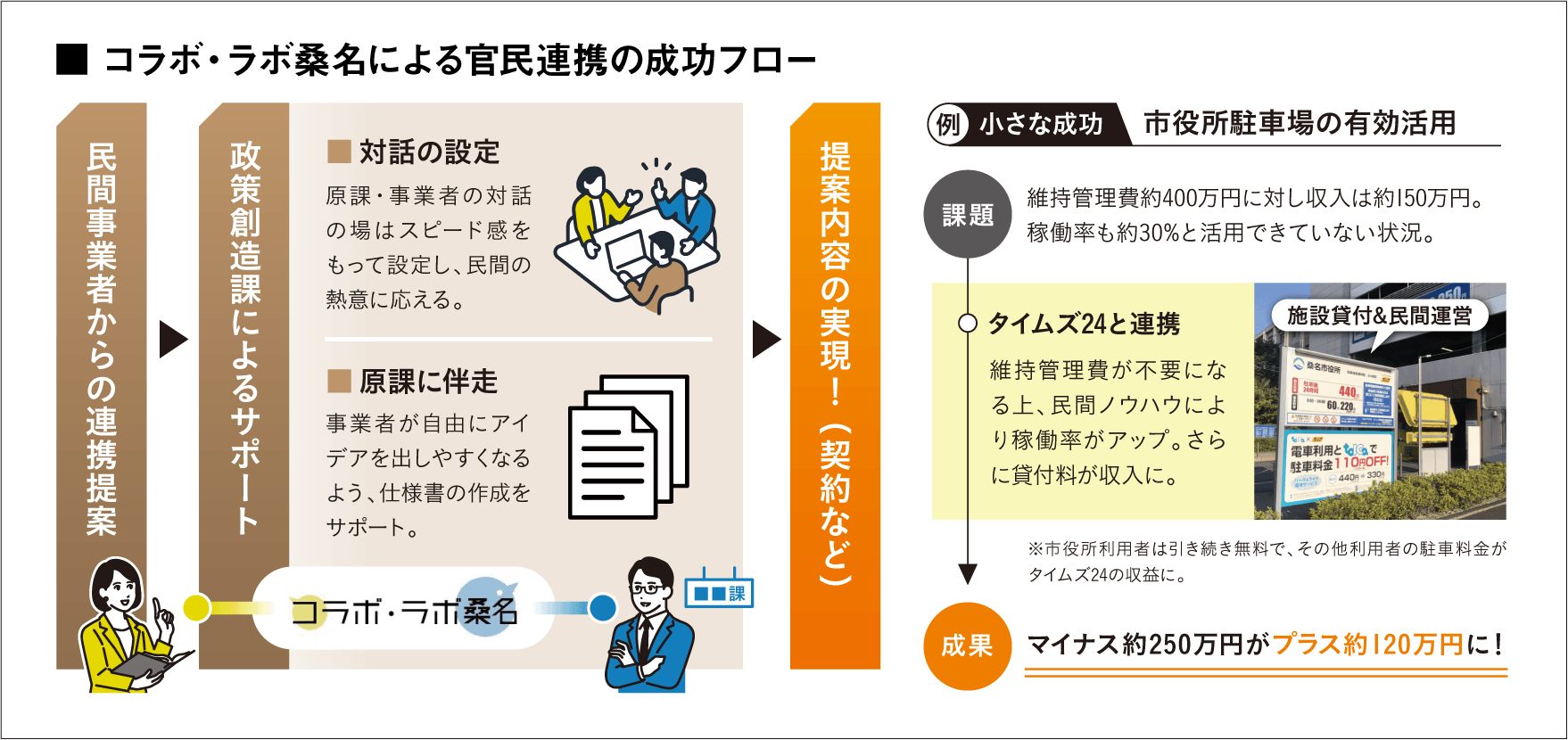 そこで同市は、取り組みのファーストステップとして民間からアイデアを募る「広告事業提案制度」、「ネーミングライツ・パートナーシップ提案制度」を開始。市の財政負担がなくとも市民サービスや利便性の向上、歳入の確保につながる事例を重ね、民間事業者と連携するメリットを共有していった。「成果を目に見える形で示せたと同時に、市民の地域に対する様々な思いや、“問い合わせ先が分からない”という民間事業者の不満、そして“思うような提案が得られない”といった職員の戸惑いも理解できました」。こうした経験から平成28年10月、「コラボ・ラボ桑名」を創設した。
