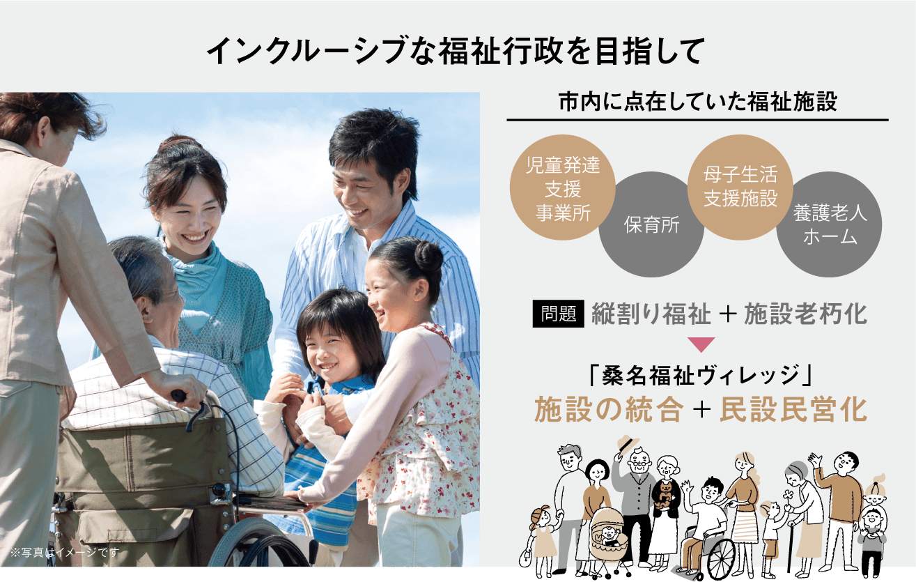 令和4年4月にオープンした「桑名福祉ヴィレッジ」。4つの福祉施設を統合したこの複合型施設は、前例のない取り組みを実現させようという官民の熱意の結晶だという。施設の構想から現在までの、桑名市の足跡を追う。