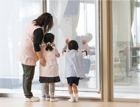 養護老人ホームの食堂からは保育所の遊戯室の様子が見えるため、高齢者にもよい刺激となる。