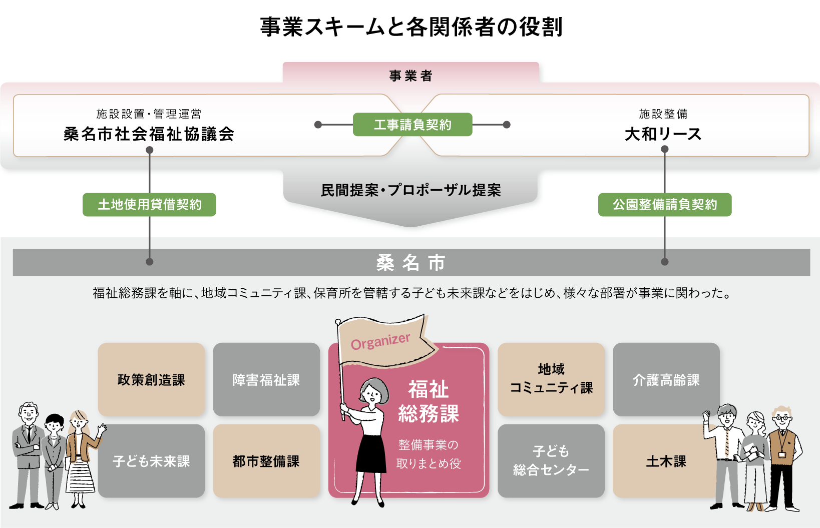 しかし、複合型の福祉施設をつくるとなるとプロジェクトの規模も大きくなる。そこで、官民連携を積極的に進めるという同市の方針を踏まえ、公募型のプロポーザルを実施。「市が所有する用地に複数施設を統合することを前提として、後は自由なアイデアを募ることにしました」。平成30年に募集を開始し、最優秀提案となったのが、公園を併設して地域との交流を生むというアイデア。同市社会福祉協議会(以下、社協)と、官民連携事業に強みをもつ「大和リース」による共同提案だった。