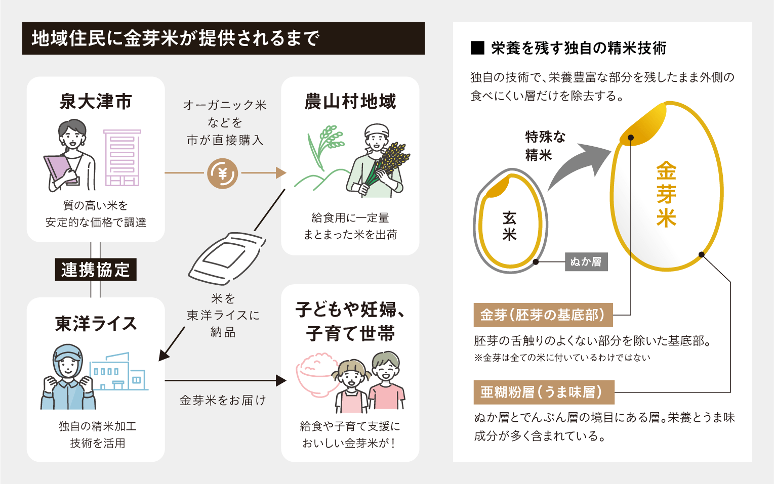 金芽米とは、同社独自の技術で精米した無洗米のこと。通常の精米では削り取られる部分を残すことで、白米よりもビタミン類や食物繊維などの栄養素や、うま味成分が多い。同市では同社と連携し、この米を学校給食や妊婦、子育て世帯に配布するプロジェクトを開始。市が産地と直接契約するなど、既存のサプライチェーンの枠を超えた改革につながっているという。