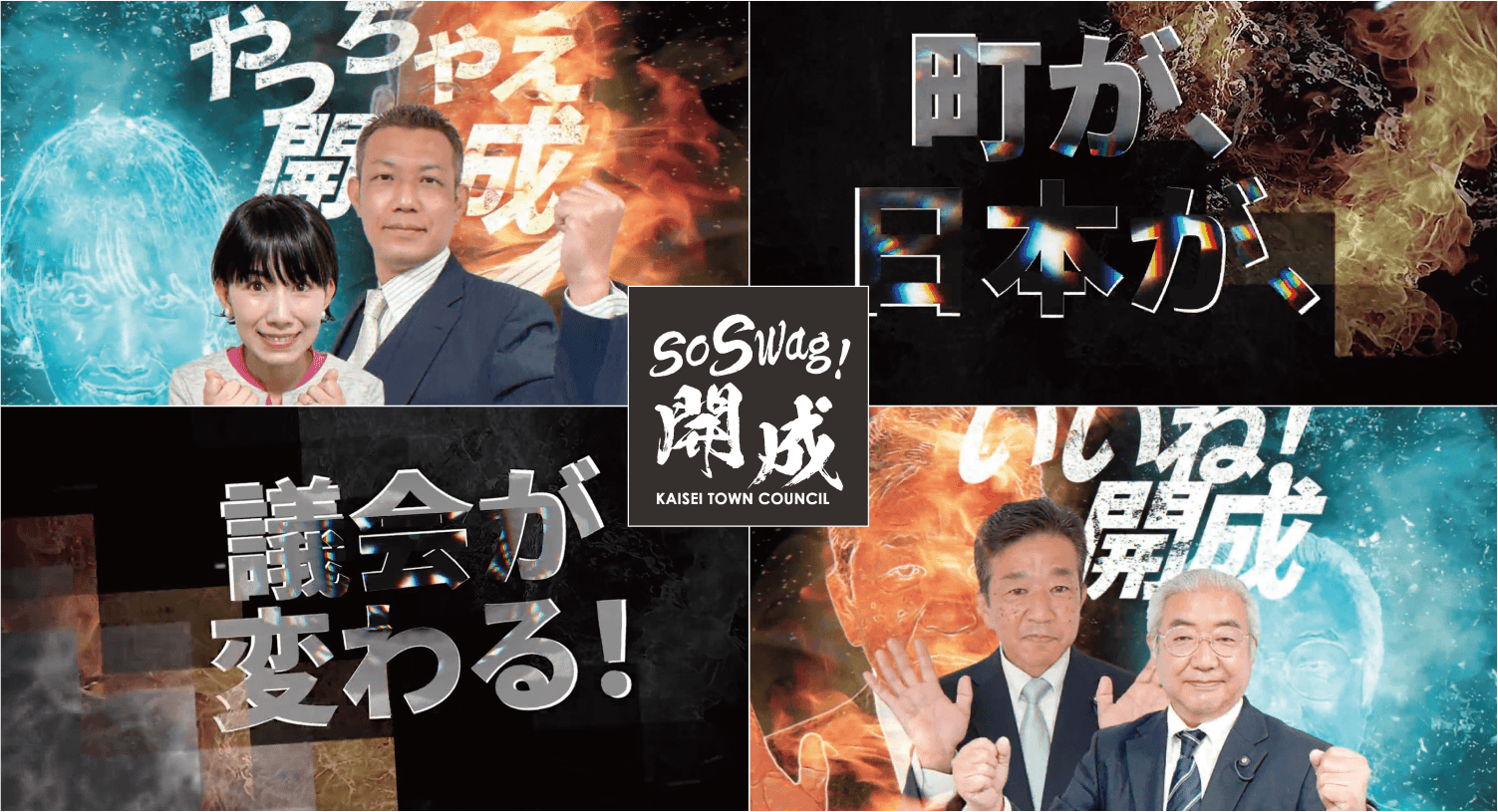 ▲同町議会のWEBサイトを開くと、議員たちが登場する、迫力あるムービーが目に飛び込んでくる。“やっちゃえ開成”“いいね!開成”など、キャッチーなフレーズは議員が考案したもの。
