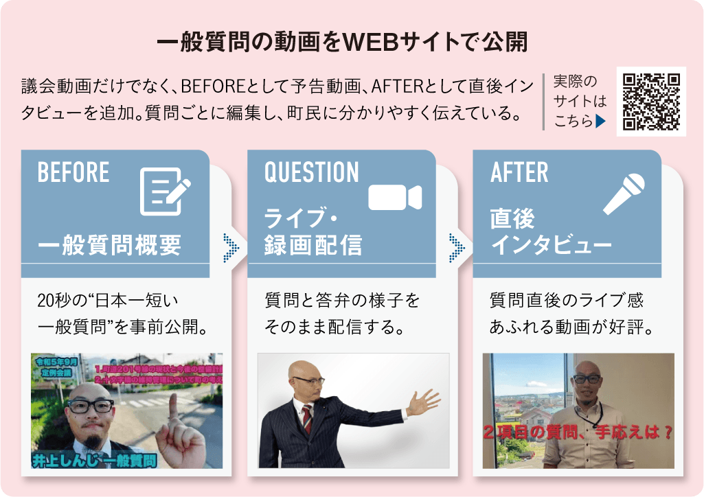 取り組みのポイントは、1人の一般質問に対して、動画が3本公開されること。一般質問の概要を20秒でまとめた予告、実際の議会における質問映像、質問を終えた議員に突撃する直後インタビューの3本だ。予告動画の撮影については議員も快諾したが、直後インタビューには難色を示す声も多かったそう。話す内容を事前に準備できない上、質問がうまくいかないこともあるからだ。しかし、佐藤さんは「結果を伝えるまでが一般質問です。うまくいかなくても真剣に勝負したことを伝えてほしい」と、粘り強く必要性を説いた。始めてみると、質問直後の議員の汗だくの姿や率直な感想は町民からも好評で、議会を身近に感じてもらえるようになったという。