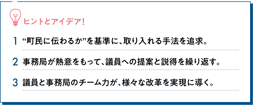 改革に着手して2年足らずの短期間で、同議会は様々な取り組みを行ってきた。それを可能にしたのは、議員12人と事務局3人のチーム力だという。「事務局からたくさんの提案をしてきましたが、それを受け入れて議会で討議し、やってみようという議員の意欲があってこそ。議員と事務局が一丸となって取り組んできたことが、結果につながったと思います。とはいえ、ただやみくもに改革すればいいとは思っていません。大切なのは、自分たちが行っていることが時代に合っているかを見極めること。そして、合わなくなったものは止める勇気をもつこと。開成町や町民のために、これからもチーム議会で取り組んでいきたいと思います」。