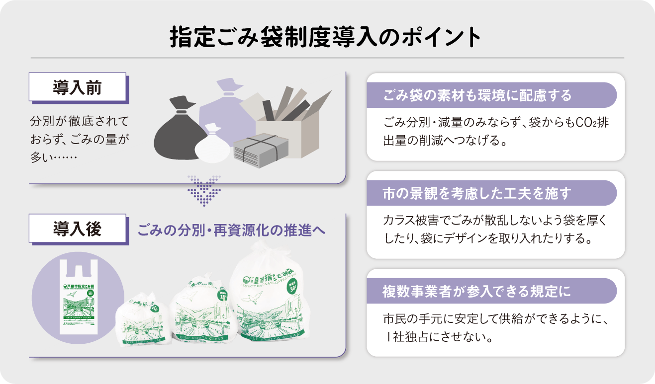 令和3年6月に「ゼロカーボンシティ」を表明し、CO2排出量削減の施策を模索していた同市。一方でごみの分別が徹底されておらず、他自治体と比較して燃やすごみの量が多いことに頭を悩ませていたという。「従来はごみ袋の指定がなく、黒や青の袋を開けると缶や瓶、小型家電が出てくることもありました」と永田さんは振り返る。中には紙袋や段ボール箱でごみを出す人もおり、地域の景観が損なわれていることも課題だったという。