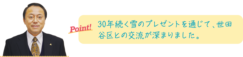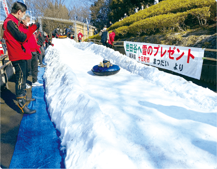 日本有数の豪雪地帯である十日町市の松代地区では、降り積もった雪を東京都世田谷区に毎年プレゼントしている。この交流は昭和61年に始まり、世田谷公園で開催される「新年子どもまつり」の目玉として、平成4年から雪を贈る取り組みがスタート。30周年を迎えた令和5年には、40tもの雪をトラックで運び、約20mの雪のすべり台やかまくらを両自治体の職員とボランティアが制作。まつりの来場者は約3万5000人にのぼったという。