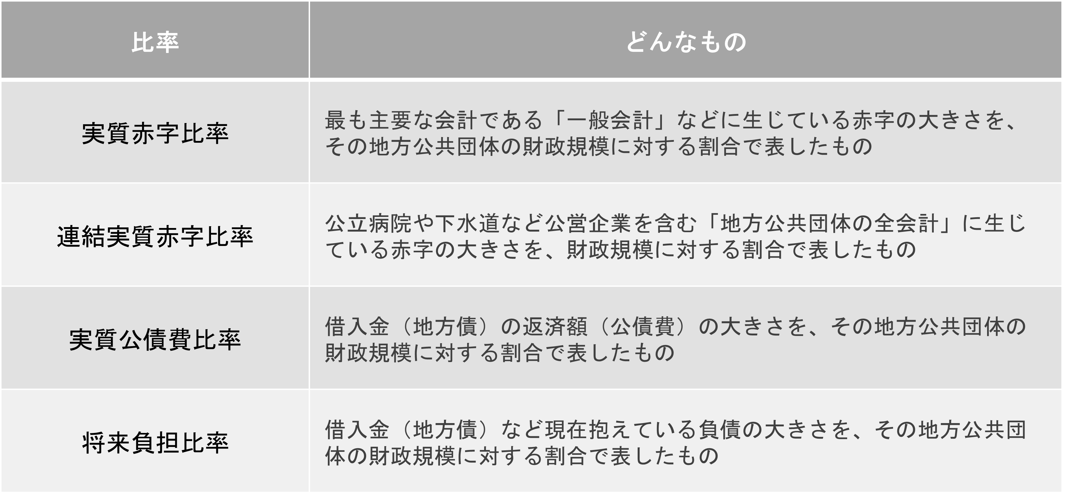 トモ:しかも1つの指標で見るのではなく、4つの指標があって、1つでも超えてしまうと財政健全化団体になったり財政再生団体になったりするんですね。全国の自治体はここにアンテナを張りながら経営しているってことか……。