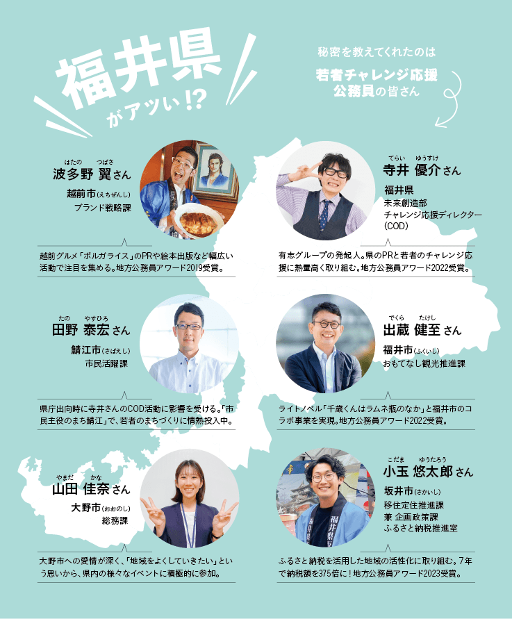 ●編集室の取材ネタ選びで候補に挙がることが多い福井。枠からはみ出すことを恐れず、行動力と発信力、受賞歴のある職員が多い印象の福井。今回は、そのアツさの秘密を探るべく、市町を越えてつながる有志グループ「若者チャレンジ応援公務員」の座談会を実施した。