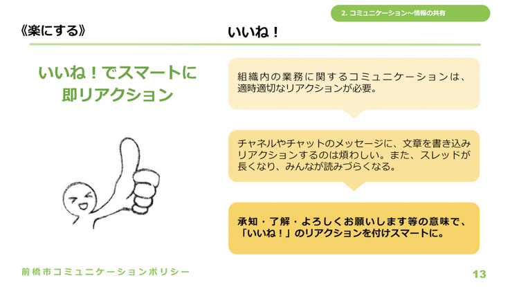 近年、社会環境の変化に伴い、業務におけるコミュニケーションの手段も変わってきている。前橋市では令和5年、全職員がモバイル端末に切り替え、クラウド環境で仕事ができるようになった。同時に、これまでは電話やメールが主なコミュニケーションツールだったが、以降はビジネスチャットに変わったという。これをきっかけに、職員同士のスタンスを揃えるための「前橋市コミュニケーションポリシー」を策定した。情報共有やコミュニケーションのあり方を見直す機会を設けたという。