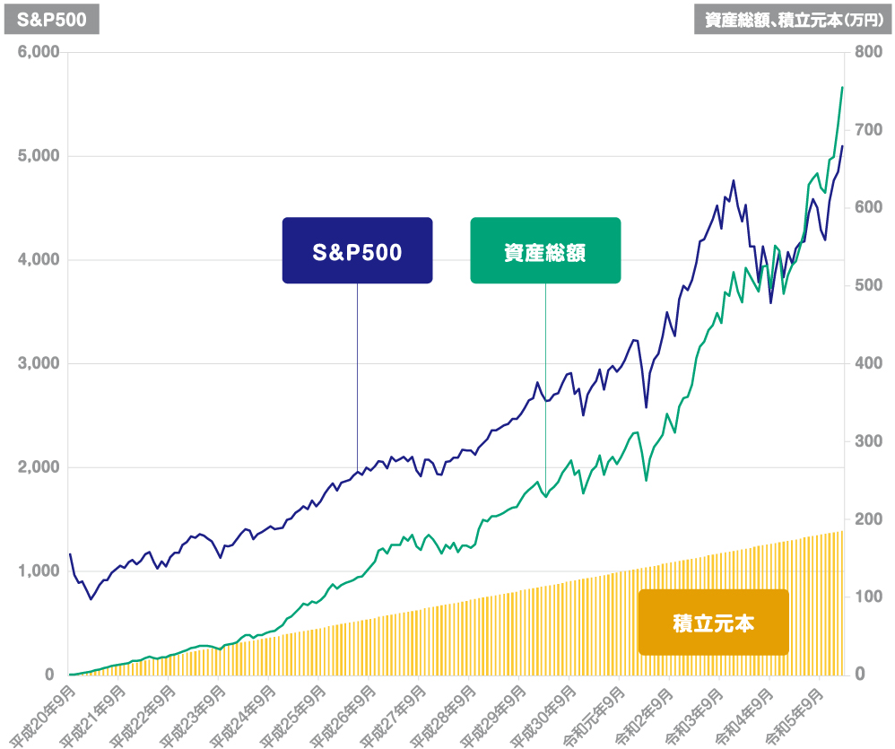 仮にリーマンショックが起こった平成20年9月から令和6年2月まで、「S&P500(米国市場に上場している主要な500社の株価をもとに算出される株価指数)」に、毎月1万円積み立てていた場合、資産は次のようになっています。