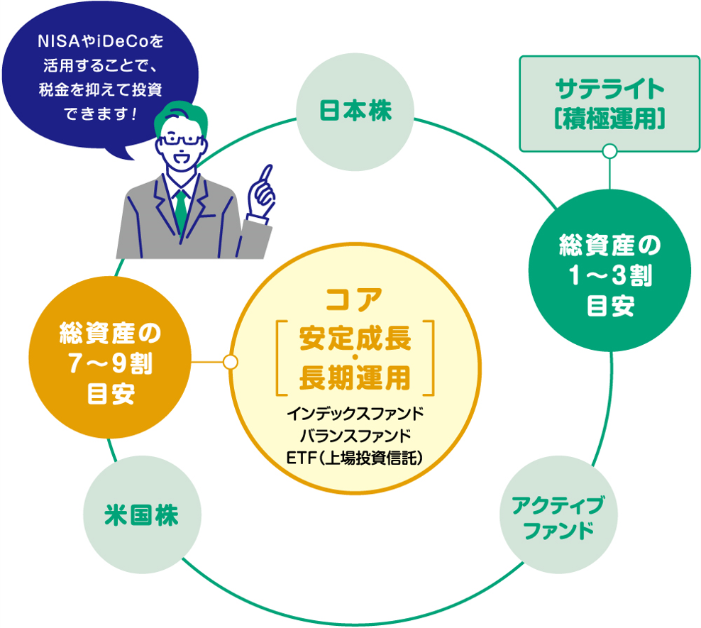新NISAでは、つみたて投資枠・成長投資枠を活用して長期・積立・分散投資を行うのが堅実です。このとき取り入れたい考え方に「コア・サテライト戦略」があります。