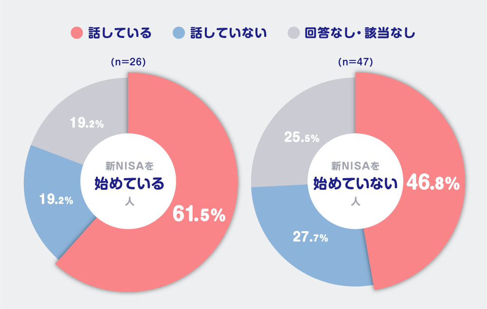 新NISAの開始有無に関わらず、全体で見ると配偶者・パートナーとお金や資産形成について「話している」が多数派になっているのは素晴らしいですね。