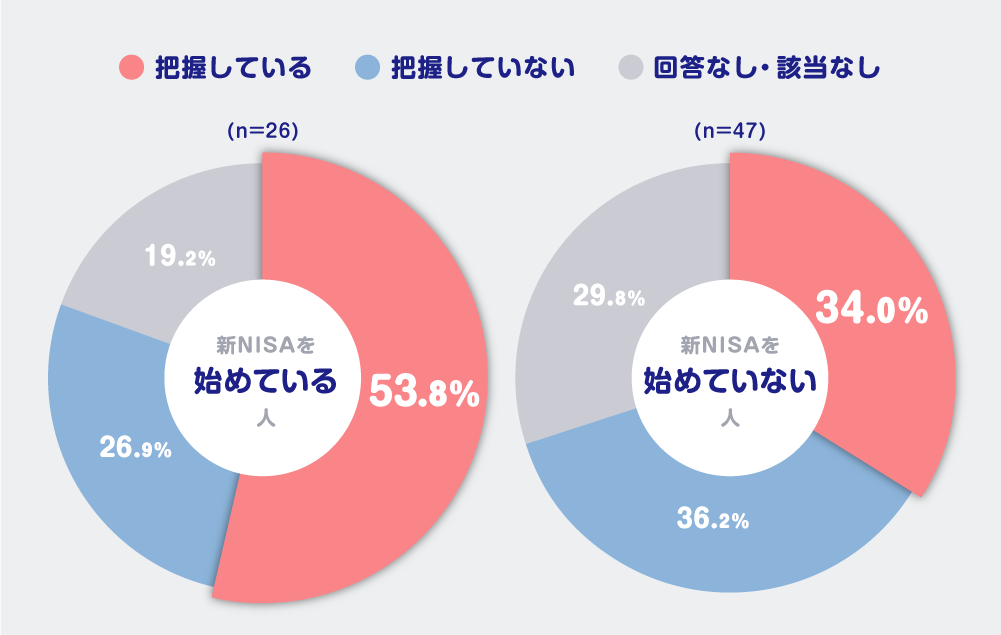 では、配偶者・パートナーの収入、貯蓄額、投資額などを把握しているかというと、新NISAを始めている人のほうが、しっかり把握している模様。新NISAを始めていない人は「把握していない」のほうが、わずかながら多くなっています。