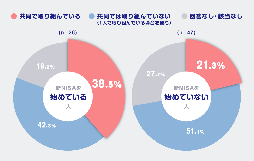 1人で資産形成に取り組んでいる場合も含みますので、その割合が多くなった可能性もあります。ただ、いずれにせよ、新NISAを始めている人のほうが「共同で取り組んでいる」の割合が多いようです。