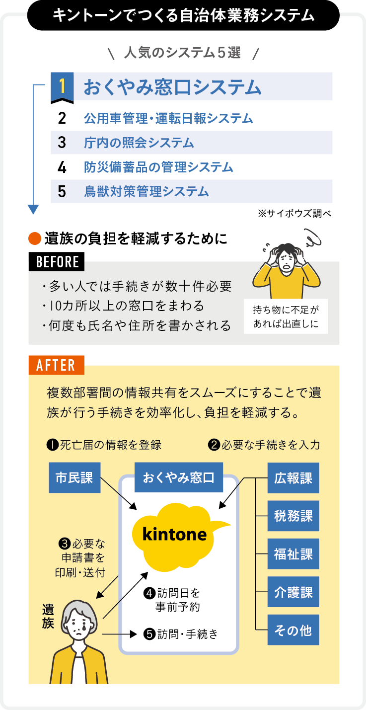 業務内容を熟知している職員自身で、現場にフィットするシステムをスピーディにつくることができるキントーン。導入自治体数は300を超え、日々新たな業務システムが誕生しているという。全職員で活用する自治体も増えており、業務効率化や情報共有、庁内コミュニケーションなどの動きが加速しているようだ。ここでは多彩な活用範囲の一部を紹介する。