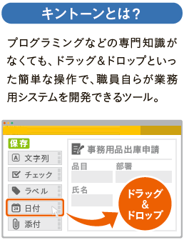 そこで、コストを抑えつつ効果を出せる方法を調査。たどり着いたのが「サイボウズ」の提供する業務改善プラットフォーム「kintone(以下、キントーン)」だった。「ITの専門家でなくても、ノーコードで業務システムが開発できることに魅力を感じました。これならパッケージソフトのない業務でもデジタル化でき、改修も手軽にできます」。