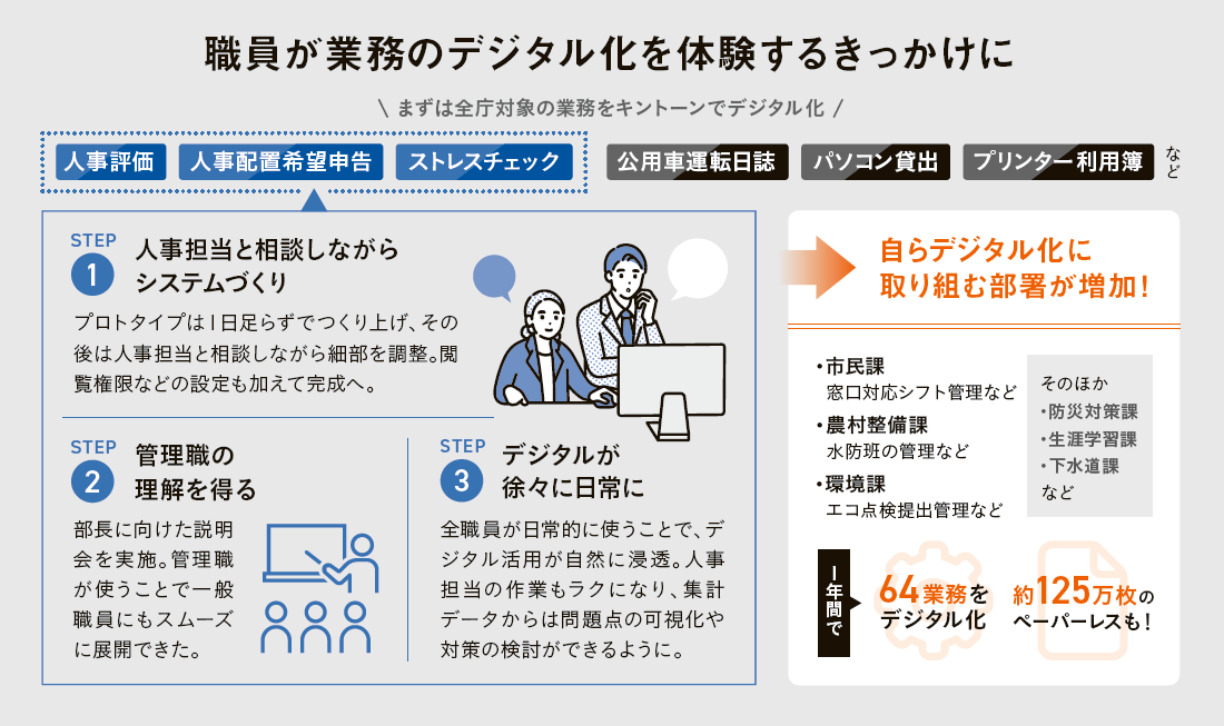 業務効率化は自治体共通の課題。取り組みを特定部署で終わらせず、いかに庁内で広げていくかが成功のポイントだろう。小城市ではシステム内製ツールに着目し、点から面へ広げる工夫で全職員を巻き込んだデジタル化を推進しているという。