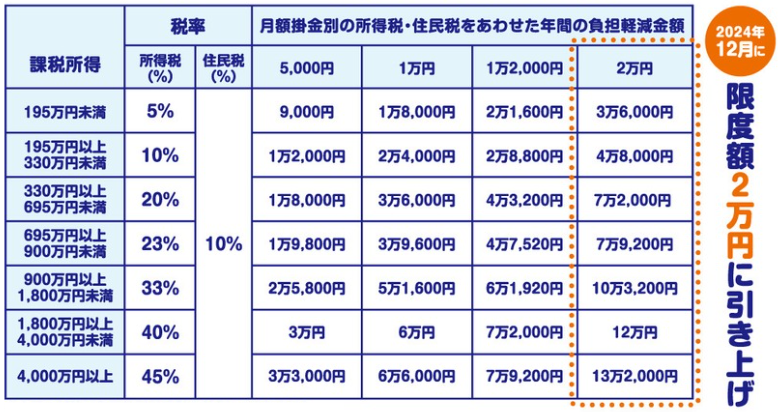 報酬が高くなるにつれて所得税率が上がる分、積立時の税負担軽減メリットも大きくなります。