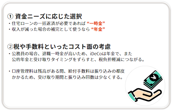 一方で、収入が減って生活費の補完資金とするのであれば、年金として定期的に受け取るのが向いています。自身の資金ニーズに合わせて、受け取り方もタイミングも決めることが最も大切です。