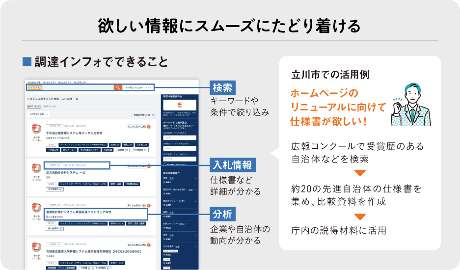 キーワードの設定や、担当課に合った活用方法を電話やWEB会議でサポート。必要な仕様書がスムーズに手に入るコツも案内する。