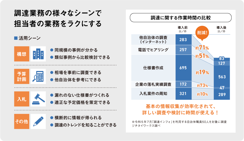 近年は官民連携の事業が活発化するなど、多くの課にとって調達業務を行う機会は増えているだろう。新規事業立ち上げなどの際に行う事例研究は、インターネット検索や他自治体へのヒアリングが一般的だが、思うように情報が得られることばかりではないという。検索で見つかる情報は、住民向けに公開されているものが多く、入札は秘匿性が高いこともあり、詳細まで聞き取るのは難しい。