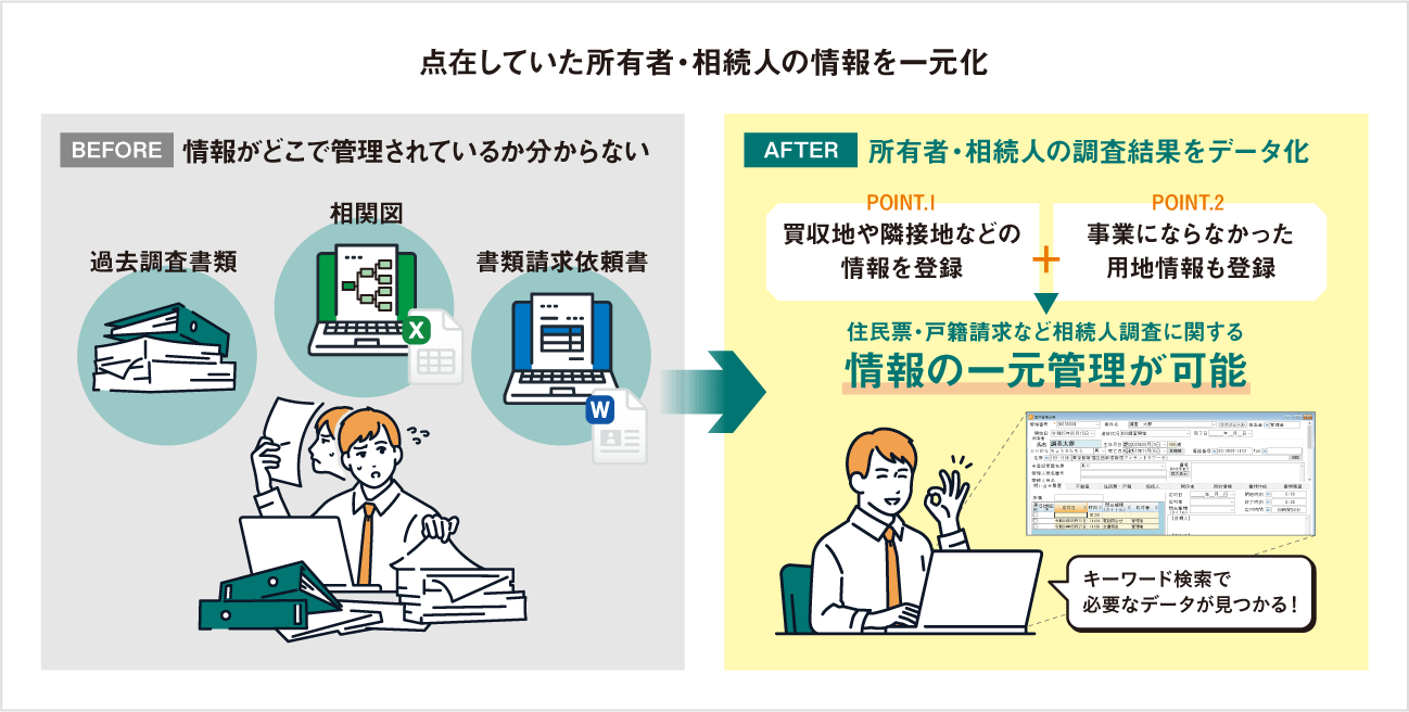 「戸籍などの書類請求については、用地調査が発生するたび、専用の書式でつくられているWordなどに情報を入力していました。また、過去の調査については、膨大な紙の資料で保管されている状態。同じ場所に保管されていても調査結果の関連性もなく、書類の所在も分からない状況からのスタートで、苦労しましたね」。自身と同じような苦労を断ち切るためにも、解決の糸口を見つけたいという思いが浦島さんの中にあったという。
