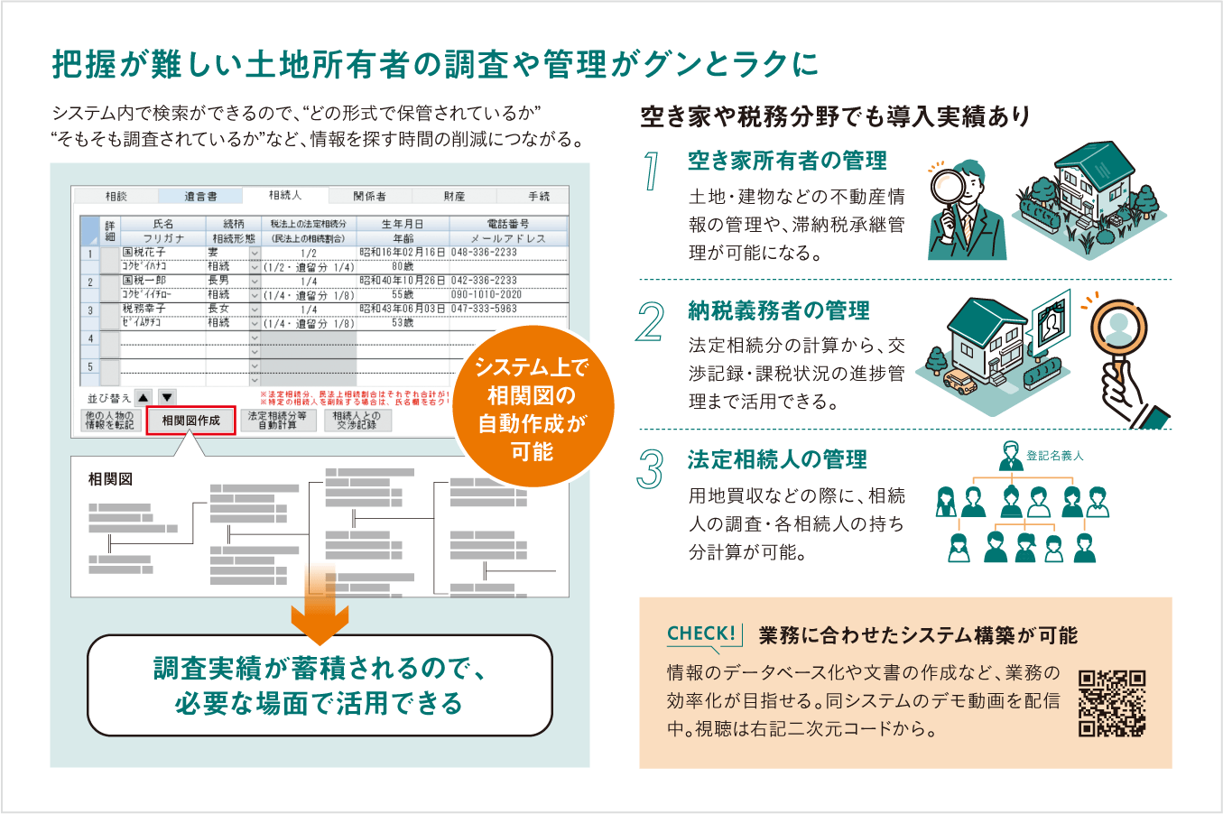 「ビービーシー」が提供する「所有者調査管理システム」を知ったのは、同市企画部からの声かけだった。土地や所有者・相続人の情報を一元管理し、調査にまつわる様々な事務作業が自動で行えるものだ。「関連のありそうな部署を対象としたデモ会を実施するという話を聞き、参加したのがきっかけです。そこでシステムのことを知り、導入することで効率化できるのではと、すぐ検討に入りました」。