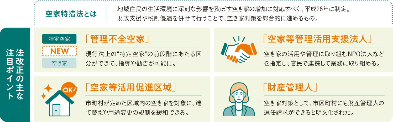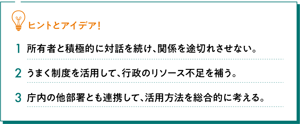 小田 空き家の所有者が不明なケースでは、そもそも指導する相手がいないので、行政ができることにも限りがあり、解決にはとても苦労していました。そんな中、空き家対策として「財産管理人」を市区町村が選任請求できると明文化されたことは非常に意義があると感じています。一方で、制度活用のハードルが高く、全国的に見てもうまくいっている事例はまだまだ少ないようです。
