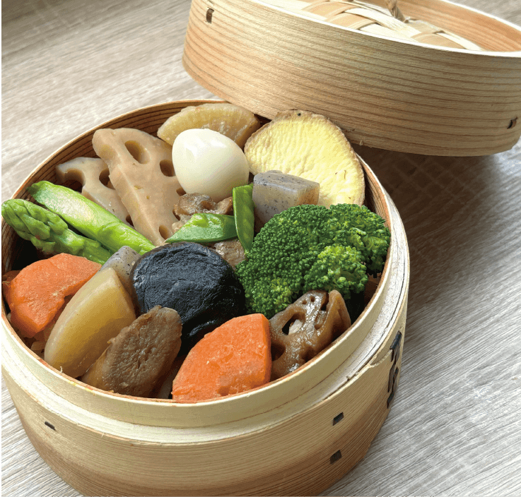 津田仙は、佐倉藩出身の農学者です。江戸幕府の使節団の通訳としてアメリカに渡り、帰国後には西洋野菜の栽培に着手。アスパラガスやイチゴの栽培に成功し、西洋野菜普及の第一人者となりました。写真のメニューは9月2日から30日まで限定で販売された「五目おこわせいろ」。仙が普及させた西洋野菜のブロッコリー、アスパラガスと地元のお米をせいろ蒸しにしたものです。