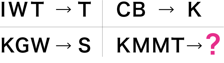 アルファベットの法則は、都道府県と地方区分です。「IWT=岩手→T=東北」「CB=千葉→K=関東」「KGW=香川→S=四国」なので、KMMTは熊本、対応する地方は九州で、「K」が正解です。